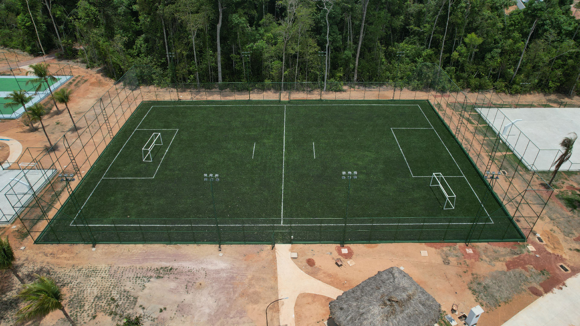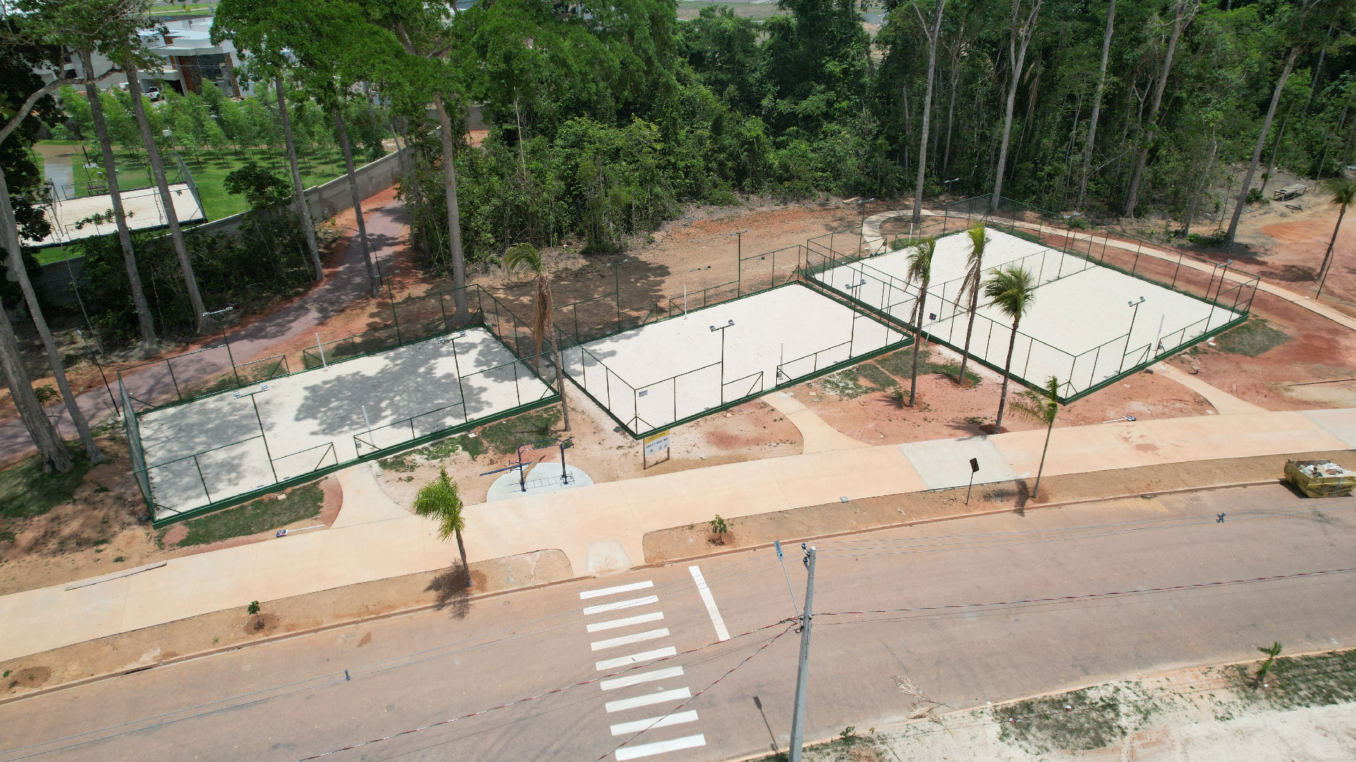 Outras frentes de trabalho estão dedicadas aos testes de irrigação, pinturas dos pisos das quadras esportivas, fechamento dos portões do pórtico e montagem de móveis na administração e guaritas.